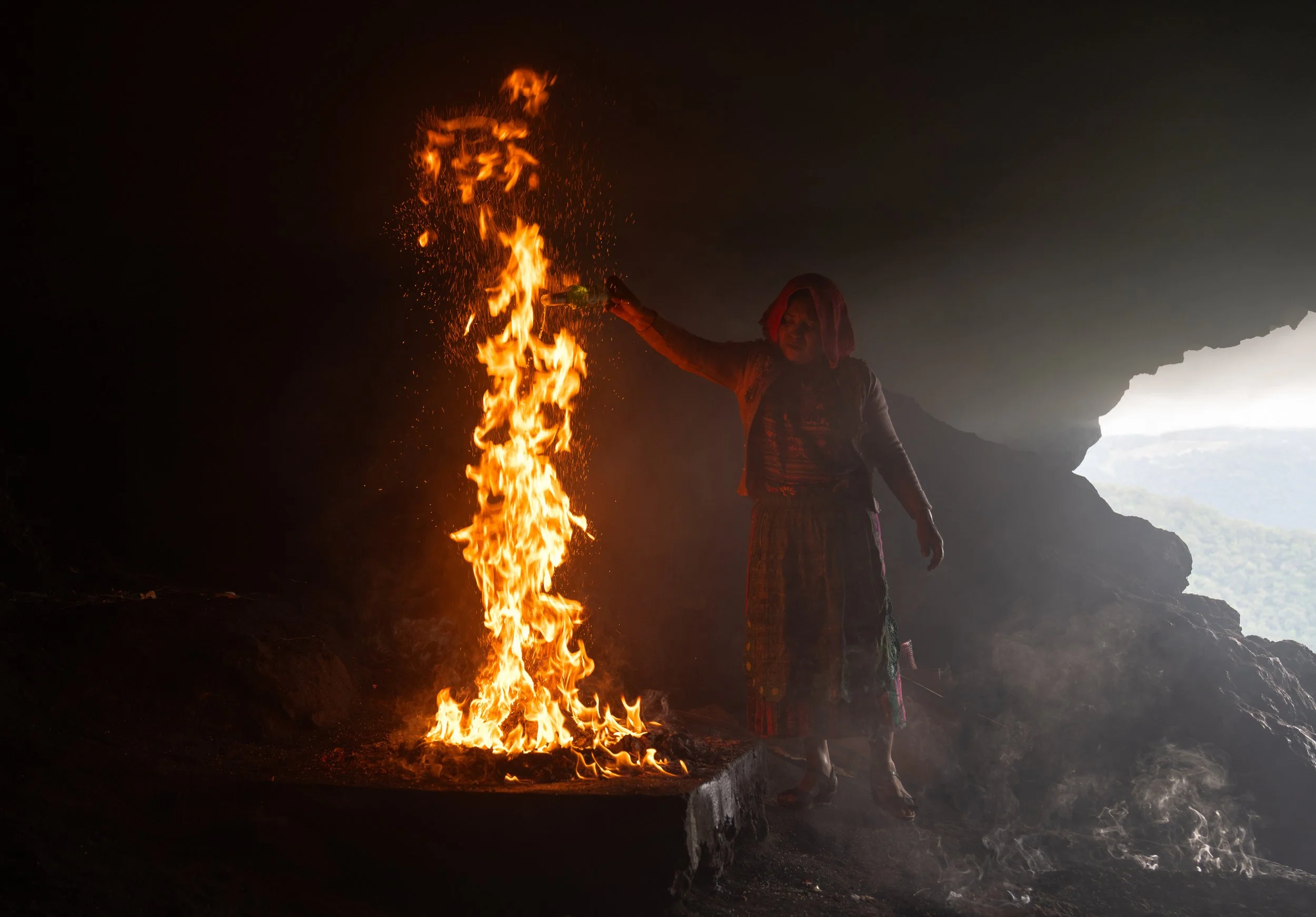 We spent several days observing the celebration in small towns around Guatemala City. We watched as giant kites were raised during the day and families gathered around the graves of loved ones, sharing stories and making offerings. One of the most memorable moments was meeting a Mayan woman in a cliffside cave, where we witnessed her offer rum, flames bursting into the air as part of her ritual.